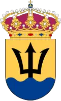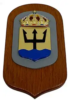 The coat of arms of the 1st Submarine Division (Första ubåtsavdelningen) 1994–1998 and the 1st Submarine Flotilla since 1998. Blazon: "Or, from a wavy base azure a trident issuant sable".[8]