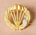 The coat of the arms of the Swedish Army Paratroop School (FJS) 1952–1994. Blazon: "Azure, a spread-out parachute with five cords inside an open chaplet of laurel, all or."[9] The coat of arms of the Swedish Paratrooper Training Corps (FJS) 1994–2000 and the Swedish Parachute Ranger School since 2000. Blazon: "Purple, a spread-out parachute with five cords inside an open chaplet of laurel, all or".[9]