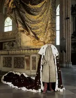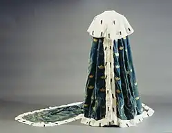 Queen Christina's coronation robe was ordered in Paris for the coronation in 1650. The blue and violet, purple velvet robe was originally decorated with 764,5 embroidered crowns in gold, and sewn on pearls. Both the crowns and the pearls were ripped out during the 18th century. The ermine collar and trimming is also missing today.[4] The robe has also been worn by Charles XI, Charles X Gustav and Charles XII. The last one to be crowned in Christina's robe was Frederick I in 1720.[5]
