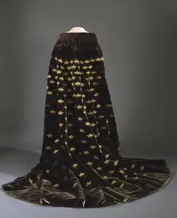 Eric XIV's coronation robe is the oldest garment that has been kept from a Swedish coronation. It is a velvet robe in a deep purple colour. Originally the robe was decorated with 455 golden crowns. The crowns are embroidered with golden, white, blue and pink silk, and on each crown ten small pearls were attached. Today only 296 of the crowns remain.[2] When king Eric was crowned the robe also had a trimming and a collar made out of ermine. After Eric XIV, John III, Charles IX and Gustav II Adolf have used the robe during their coronations.[3]
