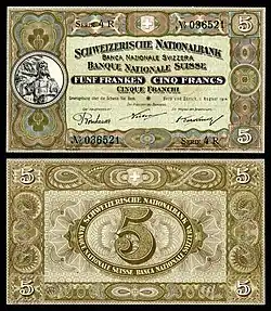 Sometime during World War I (1914–1917)[9] the bank was instructed to release notes of small denomination, for the first time, by the Federal Council of Switzerland.[1]