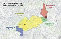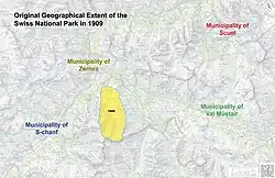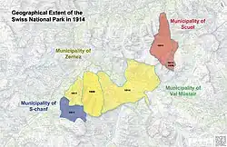 1914 137.0 km2 With the help of the federal government the park is able to expand majorly by adding 58 km2 from Zernez after having already gained additional territory in 1911 from the municipalities of Zernez, Scuol and S-chanf.