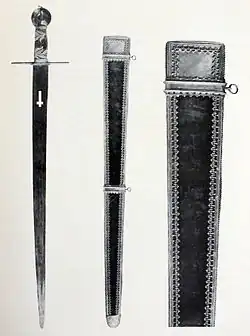 The sword was first mentioned in 1333 in the articles of inventory of the Treasury of the St. Vitus Cathedral. It is not clear when the sword was first used during coronations but in the Coronation Ordo written by Charles IV (maybe in 1347), the sword already had its ceremonial role.[1] The sword was carried by the supreme marshal of the Bohemian Kingdom in front of the king alongside the other crown jewels in the ceremonial procession to the main altar of Prague Cathedral.[2] Before the king was crowned, he was given the blessed sword for a while and after the coronation itself, the sword was used for the purpose of granting knighthoods at the end of the coronation Mass.