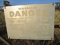 In total, over 960 kilometres of cable were laid and over one million tons of rock and soil excavated to lay the cable.[10] Main repeater stations (which were attended by staff) were constructed every 64 kilometres and minor, unmanned repeater stations every 9 kilometres (103 in total.[13] The main repeater stations also provided break out points to connect minor trunk routes to regional towns (e.g. Goulburn, Yass, Gundagai).[14] Many of the repeater stations remain today along the route, along with cable markers and other reminders of the project.