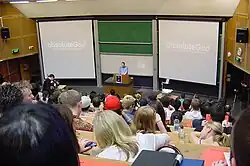 The Sydney University Evangelical Union is a registered student society of the University of Sydney, comprising an estimated 600 Christian students,[4] making it one of the largest registered clubs and societies of the Sydney University Union.[5] It is led by an elected student executive consisting of a president, male and female vice-presidents, a secretary and treasurer. They are elected annually at the September AGM.