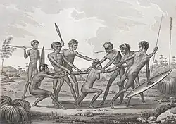 The Aboriginal group forms the inner centre piece in the tondo of both bowls. As the same image was used for both bowls, the implication is that the Chinese ceramic painters were copying from the same drawing and finishing them at the same place and time. The image is of a group of four Aboriginal men with club, shield and spears, one woman with a baby on her shoulders – standing and turned slightly away from the rest of the figures – and another woman cowed by the men. This is thought to depict a preliminary marriage ceremony.[75] As with the Museum bowl's Sydney Cove image, no directly related, surviving, version is known that would have been used by the ceramic artists to paint the Aboriginal group. The closest match is a drawing after an apparently now-lost original sketch by Nicolas-Martin Petit,[76] artist on the 1800–1803 French expedition to Australia led by Nicolas Baudin.[24] Research made around 2009–2012,[77] indicated that during Baudin's expedition, a report was prepared for Emperor Napoleon on the feasibility of capturing the British colony at Sydney Cove.[78] As this expedition progressed around coastal Australia, Petit began to specialise in the drawing of portraits of indigenous peoples.[76] The French expedition arrived at Port Jackson on 25 April 1802.[79] Petit's drawing was copied for publication as plate 114 in the Voyage autour du monde : entrepris par ordre du roi (Paris, 1825) ,[80] regarding a voyage around the world (1817–1820) led by Louis-Claude de Saulces de Freycinet.[24] The engraving is entitled Port Jackson, Nlle Hollande. Ceremonie preliminaire d'un mariage, chez les sauvages[81] (ceremony before a marriage among the natives, Port Jackson, New Holland). Port Jackson aborigines are from the Eora group of indigenous people living in the Sydney Basin.[82]