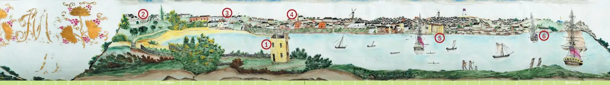 The panorama on the Library punchbowl begins with a view of the eastern shore of Sydney Cove.[83] In the foreground is an octagonal two-storey, yellow, sandstone house ①, built by Governor Macquarie in 1812 for his favourite boatman and former water bailiff, Billy or William Blue. The drawing of this little house – now the site of the Sydney Opera House — is out of all proportion to its actual modest size. To the left of the house is a sandy beach where the Circular Quay ferry wharves now stand. Facing the beach is First Government House ② where the Museum of Sydney is now situated.[62]