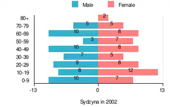 According to the 2002 Poland census, there were 124 people residing in Sydzyna village, of whom 50% were male and 50% were female. In the village, the population was spread out, with 28.2% under the age of 18, 35.5% from 18 to 44, 16.1% from 45 to 64, and 20.2% who were 65 years of age or older.[1]
