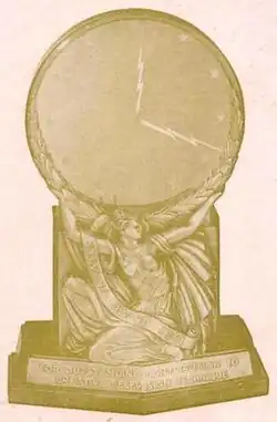 The award winners received a trophy in the form of a clock. A walnut wood base is decorated by a high-relief sculpture of a woman in a robe who carries the clock face on her shoulders. The face is made of glass, with etched gilt stars at each hour and stylized metal lightning bolts for hands. Some versions of the award were functioning electric clocks made by Jefferson Electric Company of Bellwood, Illinois.[1] In others the clock hands were permanently attached to the glass face. The clock was about 14 inches (360 mm) tall, made by the Medallic Art Co. of New York, NY.[10]