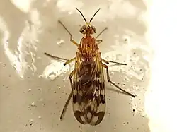 Close-up of wing pattern of a Sylvicola dubius in Auckland, New Zealand