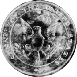 By 1830, the first Senate seal was either unserviceable due to wear or simply lost after a period of not being used. A new seal was commissioned from Robert G. Lanphier Jr., a French artist, engraver and jeweler living in Washington D.C. at the time.[1] The press and counterseal were made by Edward Stabler, the postmaster at Sandy Spring, Maryland from 1830 until his death in 1883. Stabler had engraved the seal for the House of Representatives in 1830, and also would later make the seals for most federal government departments of the time, some states, and several municipalities.[2]