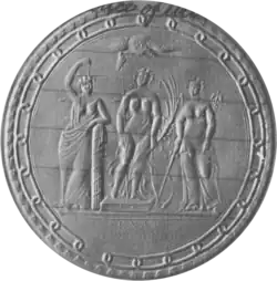 This second design was inspired by the then-popular Greek and Roman models, depicting three female figures which symbolized liberty, justice, and power. An eagle is above the figures, and twenty-four links of a chain bordering the seal represent the number of states then in the Union.[1] The central Liberty figure is standing on a platform inscribed with 4 JULY 1776, and is holding a pole with a Phrygian cap, a palm branch of victory and rejoicing, and a scroll inscribed with CONSTITUTION, MARCH 4, 1789. She is depicted in the process of walking, with one toe leaving the ground and her weight on her left foot. The Justice figure is holding the scales of justice, and leaning on fasces, a symbol of authority. The Power figure holds a sword in her right hand, and a caduceus in her left, a symbol of commerce and peace.[2]