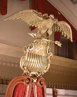 The Eagle and Shield is a gilded wood sculpture which is currently on the dais of the Old Senate Chamber, as it was when the Senate used that room in the 1800s. It dates from at least 1838, when it was referenced in a newspaper article and Daniel Webster speech, and may be from about 1834. The 1838 newspaper article includes a first-hand eyewitness account of its original installation in the Old Senate Chamber and attributes carving of the eagle and shield directly to Mr. Thomas C. Millard (1803–1870).[15] Millard was a New York City woodcarver who was active from the 1830s to 1860s and well known for his life-sized animals and human figures.[16] The eagle is life-sized at 53.5 inches (135.9 cm) high, 72 inches (182.9 cm) wide, and 23 inches (58.4 cm) deep, and the design is derived from the Great Seal of the United States. When the Senate moved to its new quarters in 1859 and the Supreme Court took over use of the room, the shield was placed over one of the outside doors, while the eagle was placed elsewhere in the room. In 1976, long after the Supreme Court moved to their own building, the two pieces were reunited and placed back on the dais when the chamber was restored. It has become an enduring symbol of the Senate.[17]