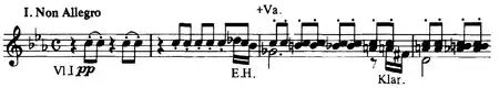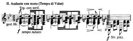 The work is fully representative of the composer's later style with its curious, shifting harmonies, the almost Prokofiev-like grotesquerie of the outer movements and the focus on individual instrumental tone colors throughout (highlighted by his use of an alto saxophone in the opening dance).[2] The opening three-note motif, introduced quietly but soon reinforced by heavily staccato chords and responsible for much of the movement's rhythmic vitality, is reminiscent of the Queen of Shemakha's theme in Rimsky-Korsakov's opera The Golden Cockerel,[5] the only music by another composer that he had taken out of Russia with him in 1917.