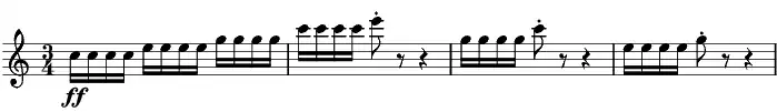 This movement fits into a historical pattern of exuberant, sometimes military expression for symphonies in C major; Mozart most celebrated symphony, the 41st, written two years later and in the same key, likewise opens with a movement in this style. The critic Richard Wigmore calls Haydn's opening movement "the apogee of [his] martial C major style, and one of the most dynamic, explosive movements he ever wrote. Amid the brass- and timpani-dominated aggression, the second theme comes as an oasis of bucolic calm."[5] A program annotator for the New York Philharmonic wrote, "The entire movement is filled with delicious touches of instrumental color spiced with harmonic surprises, including some sharp dissonance. The form of this opening movement is traditional [i.e. sonata form], but its content is as fresh as the day it was written."[6]