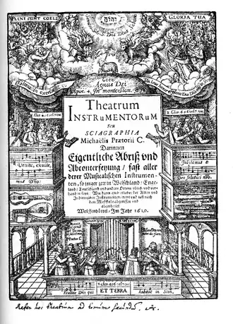 Syntagma Musicum (1614-1620) is a musical treatise in three volumes by the German composer, organist, and music theorist Michael Praetorius. It was published in Wittenberg and Wolfenbüttel. It is one of the most commonly used research sources for seventeenth-century music theory and performance practice.[1] The second volume, De Organographia, illustrates and describes musical instruments and their use; this volume in particular became a valuable guide for research and reconstruction of early instruments in the twentieth century, and thus an integral part of the early music revival.[2] Though never published, Praetorius intended to write a fourth volume on musical composition.