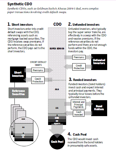 3. ^ a b The Financial Crisis Inquiry Report. National Commission on the Causes of the Financial and Economic Crisis in the United States. 2011. pp. 142–3. Firms like Goldman found synthetic CDOs cheaper and easier to create than traditional CDOs at the same time as the supply of mortgages was beginning to dry up.