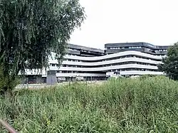 Starting from the late 1950s, the city authorities have been identifying places where to erect large housing projects: a first cluster of 11-storey buildings was constructed in the second half the 1960s in Stroma street, following a typical functionalist design.[19] By the end of the 1960s, additional and larger ensembles were completed, such as the Maria Konopnicka estate accommodating about 3700 people or the housing estate at Ugory street for 1800 residents with modest income.[19] Built using poor quality materials, these housing projects offered modest equipped apartments.[20] At the time, the area of Szwederowo was reclassified for high, multi-family buildings in the new general spatial development plan of 1964,[19] and the project of airport development was finally abandoned.