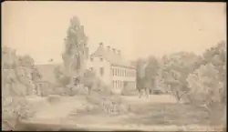 The Neoclassical main building is from 1798. The two-storey building is nine bays wide. On each side of the building is a median risalit with four pilasters tipped by a triangular pediment. The roof is a half-hipped black-glazed tile roof with four chimneys. The building was originally the central wing in a three-winged complex but the two detached side wings have been removed.[3]