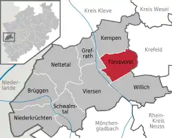 Tönisvorst is a town in the district of Viersen, in North Rhine-Westphalia, Germany. It is situated approximately 5 km west of Krefeld.