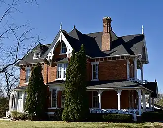 The T.B. Perry House is a historical residence located in Albia, Iowa, United States. Theodore Perry was a local attorney and businessman who served two terms in the Iowa Senate. He is also responsible for a couple of buildings in the Albia Square and Central Commercial Historic District.[2] This house is a High Victorian eclectic style structure. It is one of four large brick houses in Albia known as the Four Sisters. They all feature a running brick bond on their exterior walls. It is an unusual architectural feature for southern Iowa in the period they were built, and it also suggests they have the same architect and/or brick mason.[3] The Elbert-Bates House is another house in this group. The Perry house was designed by Charles A. Dunham from the prominent Burlington, Iowa architectural firm of Dunham & Jordan. It is noteworthy for its elaborate roofing system.[2] It features five dormer windows, two hip-and-deck roofs, three gable roofs, and two hipped roofs. The steeply pitched roof also has finials, pendants, and brackets with a modified frieze under the eaves. Other elements of the richly ornamented exterior include barge boards on the second story and entry gables, and a front porch with Gothic tracery millwork. The house was listed on the National Register of Historic Places in 1983.[1]