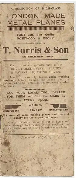 Thomas Norris is recorded as a joiners' tool-maker in Lambeth, Surrey by 1861,[5] living at 57 York Street.[6] A works address at 23 York Road, Lambeth, is also given on some tools and on the cover of the c. 1908 price list. Thomas James Norris, the eldest child of Thomas and Jane Norris is recorded as a tool maker in the 1881 census and again in the 1891 census; by the 1911 census, however, he is recorded as living at 3 Sycamore Grove, New Malden, Surrey, with a "personal occupation" of "iron plane making & repairs for joiners and cabinetmakers also general tool dealers".