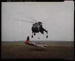 A Grounded T-33 trainer jet being lifted by a Sikorsky CH-54 Tarhe.
