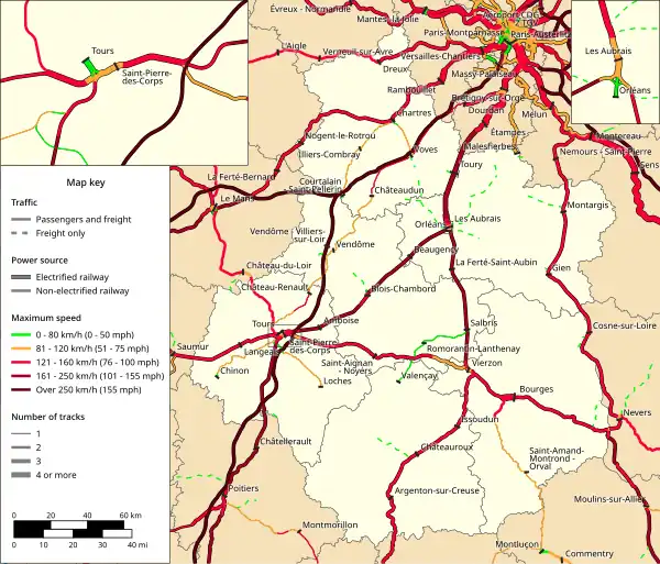 Rail transport infrastructure map of Centre-Val de Loire, showing main stations, number of tracks, power sourceand maximum speed.