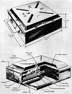 The TM-38 was a square, metal-cased Soviet anti-tank mine used during the Second World War. The mine had a large raised square central pressure plate with four reinforcing creases. When enough pressure was applied to the plate it collapses pressing down on a bolt connected to an internal lever. The lever pulls a retaining pin from the MUV fuze, which releases the striker, which impacts the MD-2 detonator.