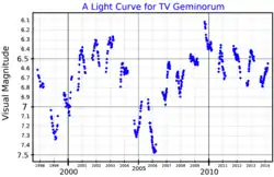 TV Geminorum is classified as a semi-regular variable star, meaning that its brightness changes are not predictable, but do show some periodicity. The General Catalogue of Variable Stars does not list a period,[3] but the International Variable Star Index gives an uncertain period of 229 days.[2] A detailed study of TV Gem between 1997 and 2014 detects periods of 411 days and 3,137 days.[7]
