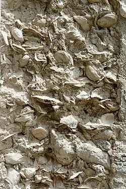 Tabby is a type of concrete made by burning oyster shells to create lime, then mixing it with water, sand, ash and broken oyster shells.[1] Tabby was used by early Spanish settlers in present-day Florida, then by British colonists primarily in coastal South Carolina and Georgia.[1] It is a man-made analogue of coquina, a naturally occurring sedimentary rock derived from shells and also used for building.[2]