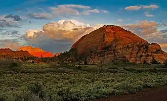 Tabernacle Dome is a 6,430-foot (1,960 meter) elevation summit located in Zion National Park, in Washington County of southwest Utah, United States.[3] Tabernacle Dome, a formation composed of Navajo Sandstone, is situated at the southeastern end of Cave Valley, 10 mi (16 km) northwest of Springdale, Utah. Its nearest higher neighbor is Cave Knoll, 1.6 mi (3 km) to the north-northwest.[1] Other neighbors include South Guardian Angel, 1.9 mi (3 km) to the east, and North Guardian Angel, 2.2 mi (4 km) to the northeast. Precipitation runoff from this mountain drains into tributaries of the Virgin River. Access to this peak is via the Kolob Terrace Road. This peak's name was officially adopted in 1934 by the U.S. Board on Geographic Names.[3] It is named for its resemblance to the Mormon Tabernacle in Salt Lake City.[4]