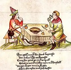 Furniture during the Middle Ages is not as well known as that of earlier or later periods, and most sources show the types used by the nobility. In the Eastern Roman Empire, tables were made of metal or wood, usually with four feet and frequently linked by x-shaped stretchers. Tables for eating were large and often round or semicircular. A combination of a small round table and a lectern seemed very popular as a writing table.[7]