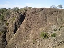 North Table Mountain and South Table Mountain are capped by the eroded remnants of a Miocene lava flow.[1] The dense, black basalt that caps North Table Mountain and South Table Mountain was initially called the Older Basalt.[2] Later it was renamed the Lovejoy Formation.[1][3] Finally, the Lovejoy Formation was renamed and is currently known as the Lovejoy Basalt.[4]