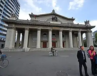 Taedongmoon Cinema was built in 1955. Its facade is lined with Greek-style columns inspired by classical architecture. Originally it had only a single screen, but since renovations to the interior in 2008, there have been two.[1] It is considered the most important cinema of Pyongyang and serves as the flagship cinema for domestic film screenings.[1] Occasionally, when foreign films are screened, the screening is for an invited audience only with no access by the general public. It is also used for screenings of the Pyongyang International Film Festival.[3]
