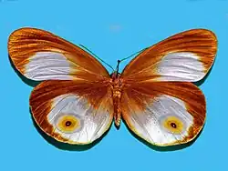 The upperside of the wings contains large white blotches, with broad brown edges and a wide eyespot surrounded with yellow orange located in the white area of the hindwings. The underside of the hindwings shows an outer angle completely brown and a wide patch with two large black eyespots surrounded with yellow orange. The abdomen is brown.[5][6][7]