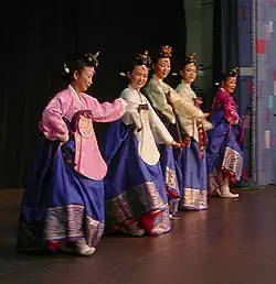 Taepyeongmu (Korean: 태평무; lit. great peace dance) is a Korean dance with the function of wishing a great peace for the country. Its exact origin is unknown, but certain style of the present was composed by Han Sŏngjun (1874–1941), an outstanding master of Korean dance in the beginning of last century. There are three assumptions regarding the origin of Taepyeongmu. One is a court dance occasionally performed by kings during the Joseon period. Therefore, the costumes used by the dancers are similar to the gwanbok (관복; lit. official clothing) formerly worn by Korea's kings and queens.[1]