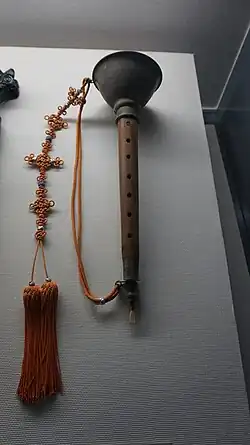 Under the Hornbostel-Sachs system of classification, taepyeongso would be designated 422.112: an oboe with a conical bore.[4] Indigenous classification systems in Korea categorize instruments by use/origin and by material. Classification by materials—called pal eum, or "eight tones"—is based on Chinese classification theory, and was used as the basis of the oft-cited 1908 document Jeungbo munheonbigo.[5] In this document, taepyeongso is classified as bamboo, perhaps to reflect its similarity to piri, another double reed instrument. In later classifications based on pal eum, however, such as Kim Gi-su's Gugak Ipmun (1983), taepyeongso is sometimes reclassified as wood.[6] The remaining six materials in this system are metal, silk, skin, stone, gourd, and clay.[7] 'Classification by use' derives from the Goryeosa ("History of Goryeo", 1451) in which instruments were categorized according to whether they were used in aak (ritual music of Chinese origin), dangak (secular music of Chinese origin), and/or sogak (indigenous music), with some instruments being included in more than one category. Meanwhile, in the Akhak gwebeom, the encyclopedic 1493 treatise on music, instruments are similarly classified under the categories aak, dangak, and hyangak (indigenous music), but here instruments are placed in only one category, suggesting an 'origin'-based scheme rather than a 'use'-based scheme.
