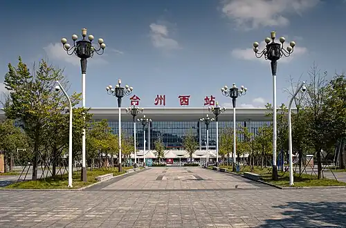In September 2009, the high-speed Ningbo–Taizhou–Wenzhou railway opened. There are several stations in the prefecture boundaries of Taizhou. The station serving the urban core is in Huangyan District and is called Taizhou railway station. A second line, the Hangzhou–Taizhou high-speed railway, opened in January 2022.[13] Taizhou Central railway station on the line will serve Jiaojiang District.