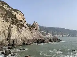 At 651 kilometres (405 mi), Taizhou has a long coastline dotted with numerous islands; the largest one is Yuhuan Island in the south.[3] Coastal areas in the east tend to flat, with an occasional hill. Eastern and northern parts of Taizhou are mountainous, with Yandangshan Mountains in the southwest, Kuocang Mountains (Chinese: 括苍山; pinyin: Kuòcāng Shān) in the west, and Mount Tiantai in the northwest. The highest point of Taizhou is Mishailang (Chinese: 米筛浪; pinyin: Mǐshāilàng), a 1,382.4 metres (4,535 ft) peak in the Kuocang Mountains, and also the highest point in the east of the Zhejiang Province.[3]