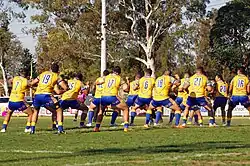 ![]() Niue national rugby league team performing Takalo before one of their test matches | |