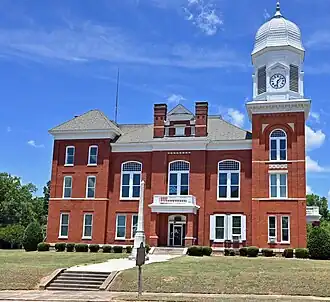 The three-story red brick facility features corner towers with pyramidal and white ogee-shaped roofs. One of the towers is a four-story clock tower with an octagonally shaped domed cupola.[5] Elements of the building include a variety of window shapes and sizes, round, segmental and flat arches, and a granite white trim. Each of the four sides of the building features a central one-story entry porch. Each porch has six steps leading to the entrance. A small guardhouse is located on the southeast corner of the square. A confederate monument is located on the south lawn of the courthouse. The monument was placed on April 26, 1898.[5]