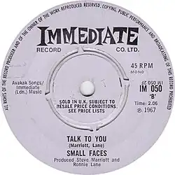 "Talk to You" is a song by English rock band Small Faces. It was recorded in 1967 and issued as the B-side of "Here Come the Nice" that peaked at number 12 on the UK Singles Chart.[3][4][5]