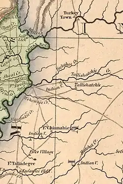 There are historic shell mounds along the creek.[4] In 1560 Spanish troops under Tristán de Luna y Arellano began an expedition against the Napochie people from a location between Talladega Creek and Tallasseehatchee Creek.[5] It is notable as the site of a Muscogee tribal town destroyed at the Battle of Tallushatchee in 1813.[6]