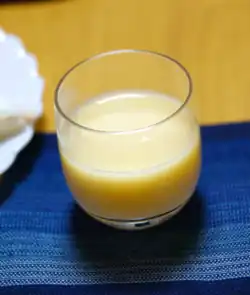 | Preparation | The raw egg yolk and honey/sugar are mixed into 3/4 cup hot sake . |