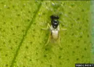 The adults of Tamarixia radiata are small, 0.92 to 1.04 mm long, black wasps. They have widely separated eyes, which are red in newly emerged adults,[2] on a head which is slightly wider than its length, and transparent wings with pale yellow veins. There is marked sexual dimorphism, with the male antennae being one and a half times the length of female antennae.[3] The antennae of the males have long and slightly curved setae while female antennae have short setae.[4] The males are also slightly smaller than females in length and have smaller wings and darker abdomens.[2] On the females, the ovipositor barely protrudes.[3] In both males and females the head and thorax are shiny black and the posterior dorsal and lateral portions of the gastric segments are black and the vent and a patch on the anterior dorsal gaster are pale, sometime yellow.[4] The legs are off white in colour.[2]