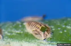 Tamarixia radiata is an idiobiont ectoparasitoid of Diaphorina citri.[6] The female wasp lays one or occasionally two eggs on the underside of a nymph of its host, between the third pair of legs.[6] Even if two eggs are laid beneath a nymph, only one adult wasp will result, so T. radiata is a solitary parasitoid. One adult female T. radiata can lay up to 300 eggs in her life. On hatching the larvae attach themselves to the host and begin to feed on its haemolymph which eventually results in the death of the host. The newly hatched larvae are about 0.28mm long and 0.11mm wide. Larvae go through four instars and reach 0.14 mm long and 0.59 mm wide in their fourth instar.[3] In the later stages of its growth, the larval T. radiata will have totally excavated the body cavity of the host nymph.[8] The nymph's body turns a dark brown colour and becomes "mummified".[9] The T radiata pupa extrudes silk which is used to adhere the excavated host's body to the twig where the nymph was feeding and sometimes the silk can be seen around a nymph with a T. radiata pupa within[8] The larvae then pupates within the remains of the host and the adult wasp emerges through a hole, visible to the naked eye, in the nymph's thorax or head. The wasps will parasitise any age of host nymph but prefer the fifth instar nymphs. Under laboratory conditions, the development time from oviposition to the emergence of the adult from the host can take 11.4 days.[3]