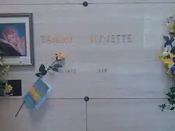 Wynette was plagued by health problems throughout her life. Her health declined even more in the final years of her life and she began to look frailer.[122] Nashville writer Alanna Nash recalled watching one of Wynette's final music videos and remembered her physical condition: "Tammy looked ancient, like a plant that had withered up about to die. I thought, 'this woman is dying – why isn't somebody doing something?'"[101] Wynette died on April 6, 1998, while sleeping at her Nashville, Tennessee, home. She was 55 years old.[123] Husband George Richey and Wynette were sleeping all day on adjacent living room couches when he discovered that evening that she was dead.[124] Her death was certified by her doctor, Wallis Marsh, who flew from Pennsylvania to make it official. He stated in his original report that Wynette died from a blood clot in her lung.[125]