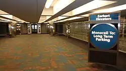 An automated monorail system also once connected the main terminal on Level 5 to the long-term parking garage,[20] stopping at each elevator bank in both buildings. It was installed in 1991 when the long-term parking garage was built.[10] It used six Bombardier UM III vehicles (known today as the Innovia Monorail 100), which are also used on the Jacksonville Skyway.[1]