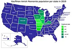 In 2010, there were 16 congregations of Kauffman Amish Mennonites.[1] In 2017 they had around 2,000 baptized members and lived mainly in Missouri and Arkansas.[2]